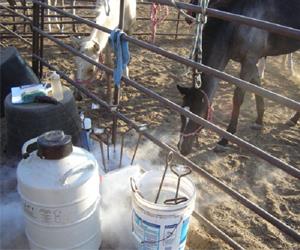 Freeze branding is done by cooling the branding iron to a temperature of −160 to −250 degrees Celsius, depending on the coolant used, and then pressing the brand to a shaved patch of skin on a pigmented animal. The area will be temporarily inflamed but will heal within a few days. The hair falls out, and after two to three months hair will be fully regrown, without pigment. The hair will continue to grow white from that point onward, so this is still permanent for animals that shed their coats. On white-haired animals, the brand is kept on longer, destroying the hair follicle altogether, and the area remains bald, and thus the brand can still be used to identify white-haired animals.